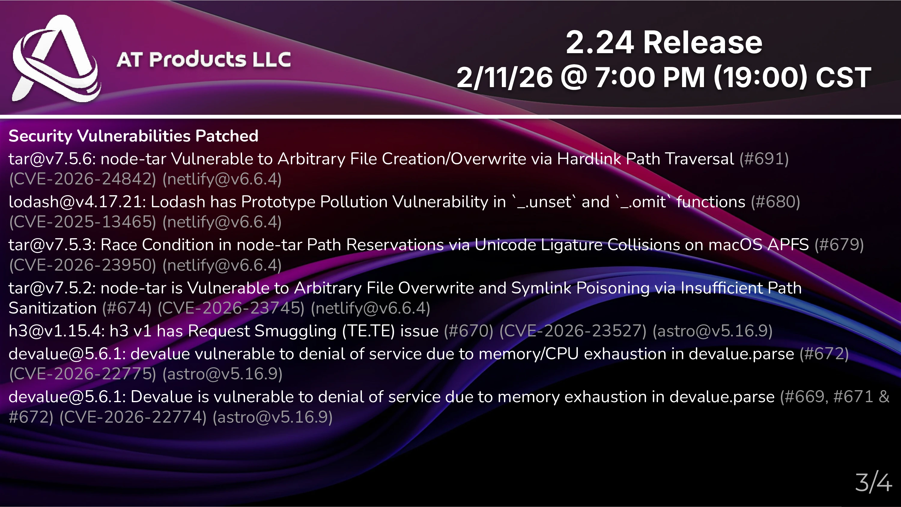 tar@v7.5.6: node-tar Vulnerable to Arbitrary File Creation/Overwrite via Hardlink Path Traversal. (#691) (CVE-2026-24842)lodash@v4.17.21: Prototype Pollution Vulnerability in_.unsetand_.omit. (#680) (CVE-2025-13465)tar@v7.5.3: Race Condition in node-tar Path Reservations via Unicode Ligature Collisions on macOS APFS. (#679) (CVE-2026-23950)tar@v7.5.2: Arbitrary File Overwrite and Symlink Poisoning via Insufficient Path Sanitization. (#674) (CVE-2026-23745)h3@v1.15.4: Request Smuggling (TE.TE) issue. (#670) (CVE-2026-23527)devalue@5.6.1: DoS via memory/CPU exhaustion indevalue.parse. (#672) (CVE-2026-22775)devalue@5.6.1: DoS via memory exhaustion indevalue.parse. (#669, #671 & #672) (CVE-2026-22774)